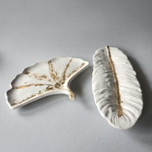 Ovo je savršen komad za izlaganje posebnog nakita ili drugih dragocenih sitnica koje želite da sačuvate i istaknete. Njena čista bela boja i topli zlatni detalji čine je idealnim poklonom za voljenu osobu ili za proslavu posebnih momenata.